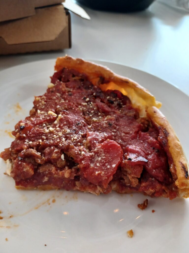 This had a lot of sweet pizza sauce with large chunks of tomato. There was a thick layer of cheese at the base that gave a really nice, salty punch. The sausage was of good quality and in large chunks. The crust was crispy and cracker-like with a butter cookie-type sweetness.