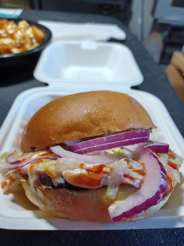 The patty was dense and pre-formed. It seemed to be seasoned quite a bit. The grill did add a little charcoal flavour. The cheese was standard processed cheddar. The brioche-style bun was probably the best part of the burger. It was pretty heavy on the toppings, which actually detracted a bit from the burger.