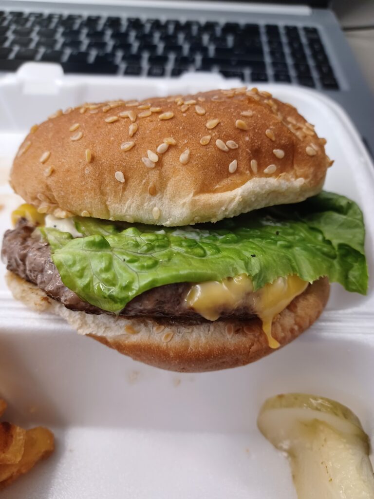 This burger had a real, unseasoned ¼ lb patty cooked on a flat top. It was topped with processed cheddar. The toasted sesame bun was nice and the vegetables were pretty fresh.