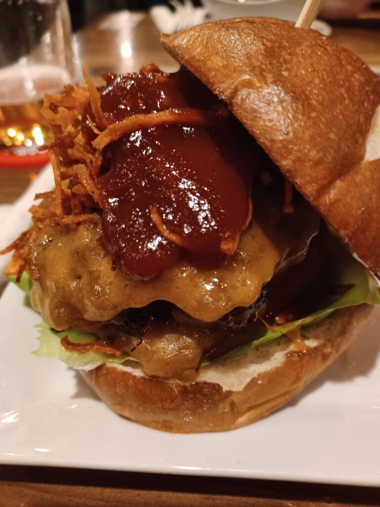 This burger had thin patties which were crispy on the outside yet still cooked medium on the inside. It had a lot of cheddar cheese. Some nice crispy onions and a BBQ sauce. It also had lettuce. It all came on a brioche-style bun. I enjoyed it, but I feel like a mayo-based sauce might have been even better.