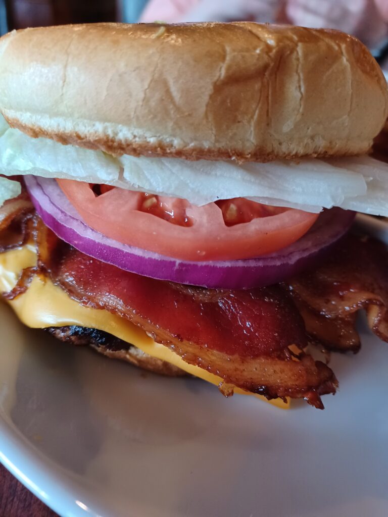 The burger featured a large (close to 8 oz.) patty that was grilled to well-done. It was topped with a slice of processed cheese. There was a generous amount of perfectly cooked bacon. The somewhat generic bun was lightly toasted. The vegetables were appropriately proportioned.