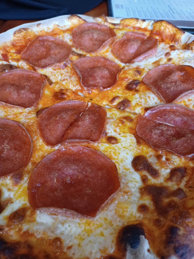 This pizza was significantly larger than I expected. The thin crust was nicely crispy with a little bit of char, though I would have liked much more char. The sauce was good. The quality of the cheese was good and it was quite salty. I liked that the pepperoni was on top of the cheese, but it was more of a large, “cold-cut”-style pepperoni, than my preferred small, cup-style pepperoni.