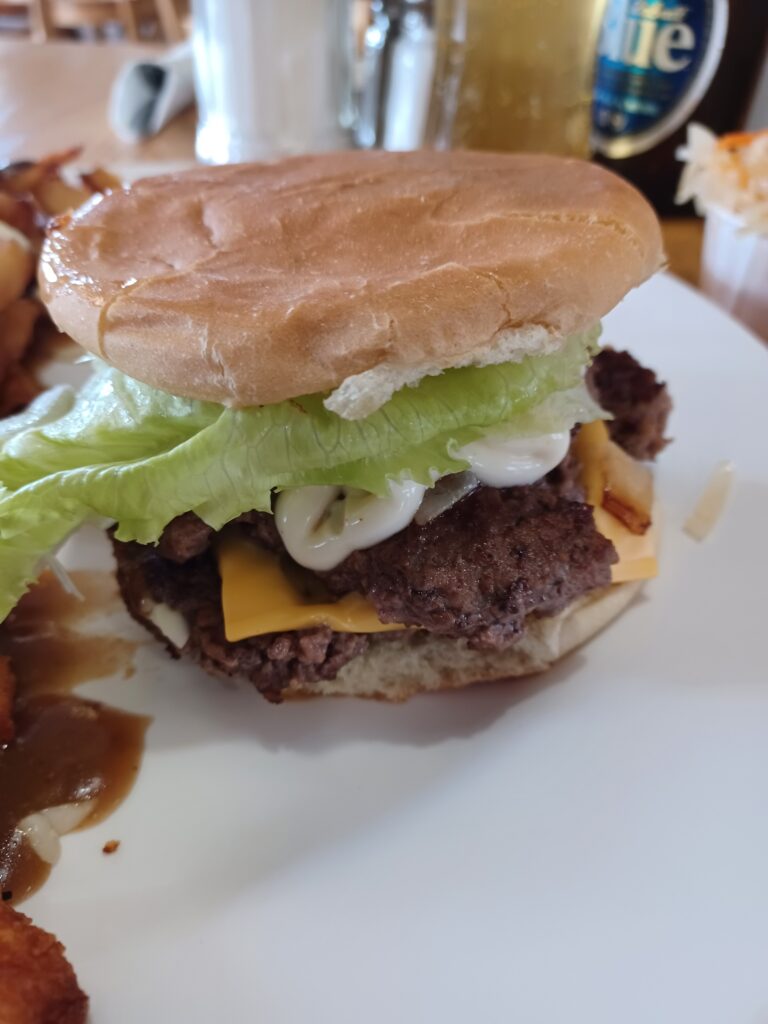 The burger came with 2 thin (not quite smash) patties that had a crispy exterior while being soft inside. They were topped with processed cheese. The grilled onions really helped this burger along. The only weaker part of the burger was a relatively boring bun, but it was at least well toasted.