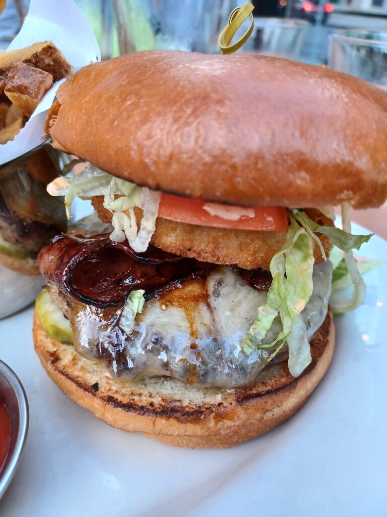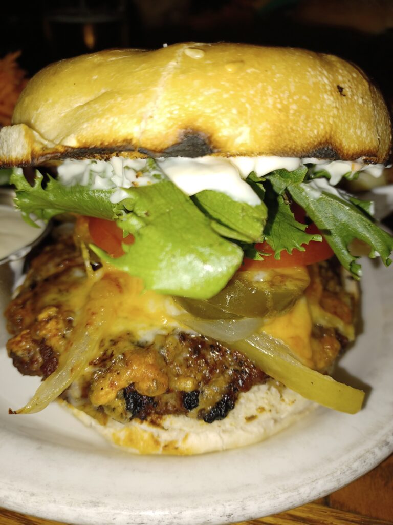 The patty was well-done and topped with a smoked cheddar. It also had peppercorn bacon and an onion ring. The chipotle mayo was good, but it could have used a little bit more. There were really good quality ingredients across the board, but the sum of all the parts just didn’t quite add up to as much as it should have. It was still quite a strong effort.
