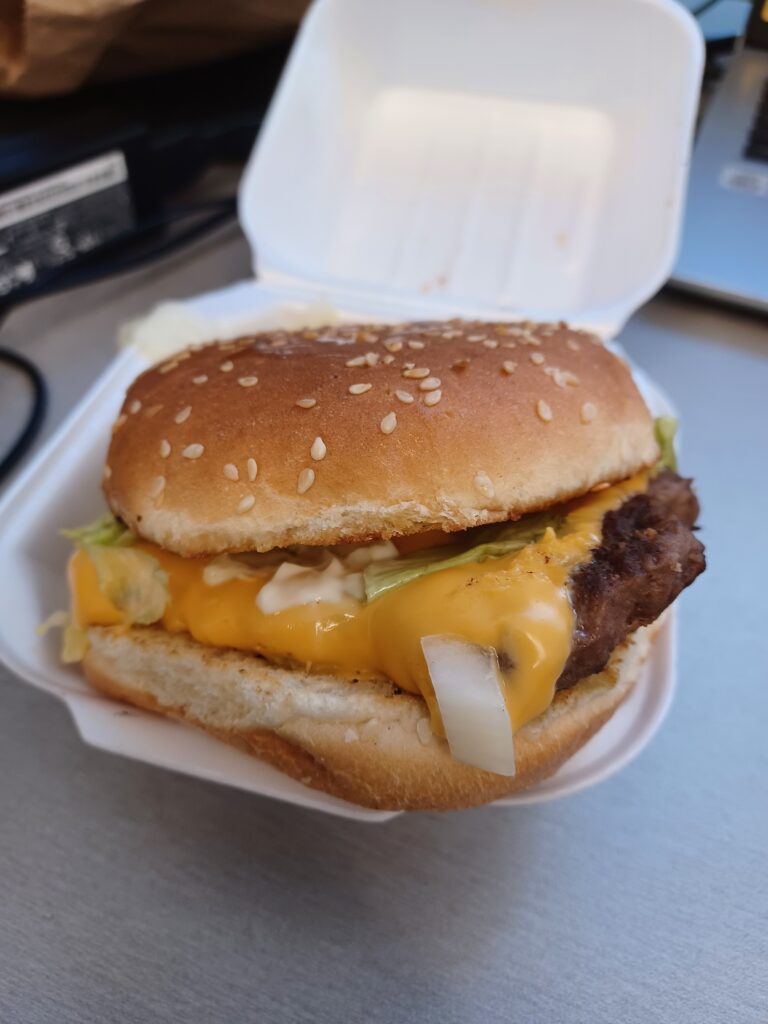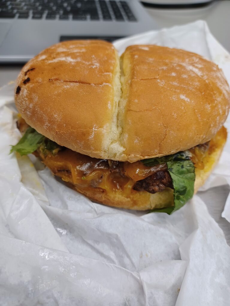 The burger was on the smaller side. The sesame bun was good. I got a double because the patties were much less than a quarter pound (similar to a McDonald’s burger), except they were “real” (hand-formed). The cheese was standard processed cheddar. They offered free fried onions, which is always a bonus. The lettuce was shaved.