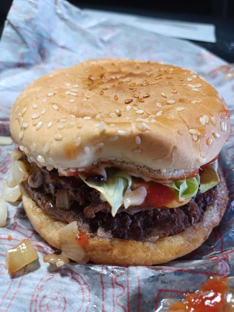The patty was much thicker than it was in years past. It was cooked very well-done which resulted in it being a little dry. There was a nice quality cheese on top of the patty. This burger came with jalapenos and grilled onions which were both good. The best part of the burger was the home-style bun which was well toasted.