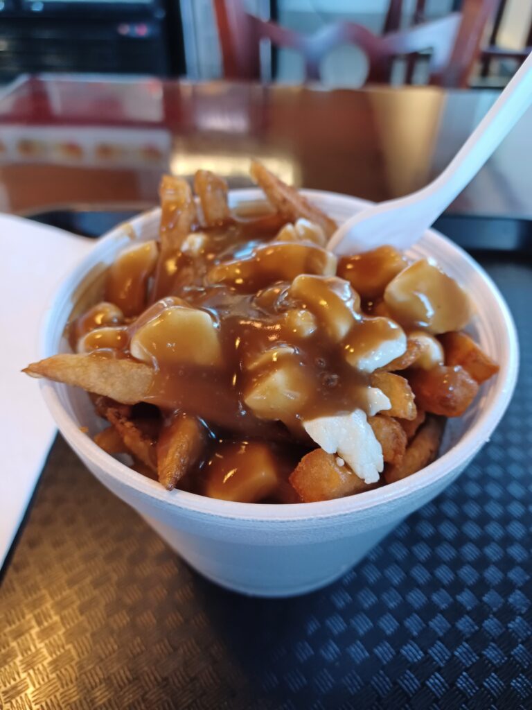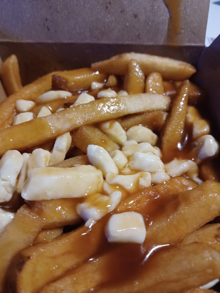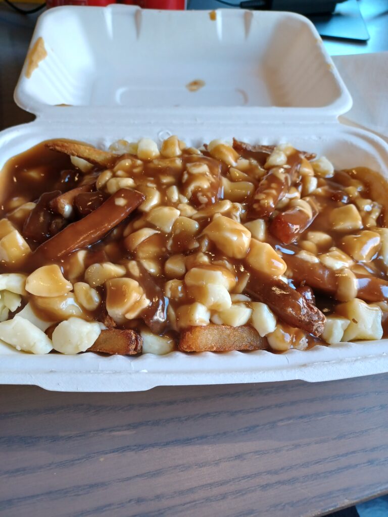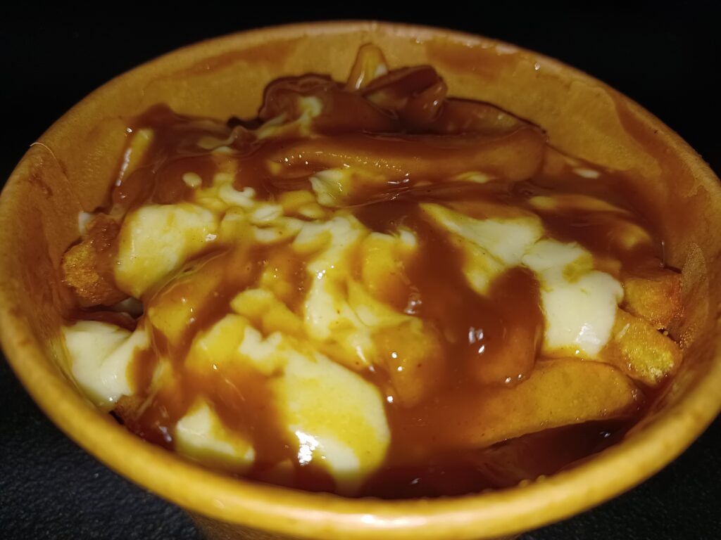 The frozen fries stayed crispy, but they were a little dry. The gravy was reasonably good if a little light. It was lacking a little bit in the cheese curds department.