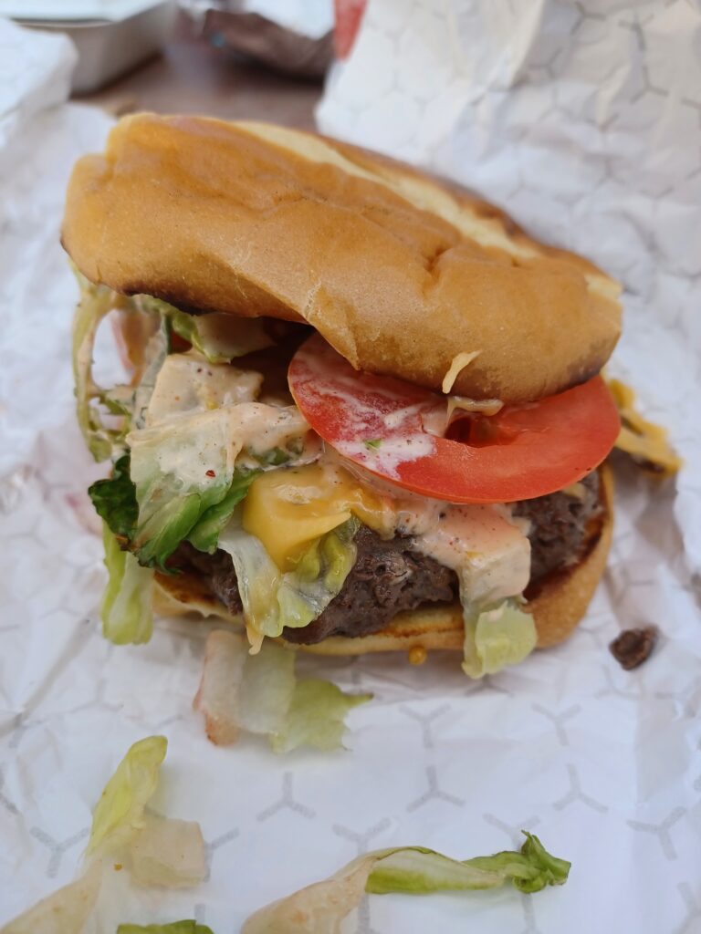The burger came with a pretty thick 6-ish ounce patty. It had a decent amount of cheese. The bun was quite soft and seemed eggy. The veggies were pretty standard. The separator here was the Baja sauce which was interesting – a very mild creamy chili sauce that I kinda wished included mayo.