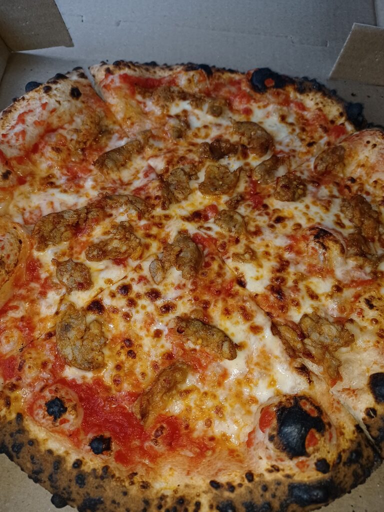 This pizza was a good example of Neapolitan-style. The thin crust was pleasantly chewy and nicely charred. The sauce was pretty basic, but adequate. There was a reasonable amount of cheese. The sausage was nice and spicy, which was a pleasant surprise. I thought it needed more herbs. Some pizzas came with basil, which would have been great (this one came with olives that I requested be omitted because I just can’t stand them, but maybe the brininess for those who enjoy olives would have balanced it). It wasn’t the best pizza I’ve ever had, but it was significantly better than most pizzas in town.
