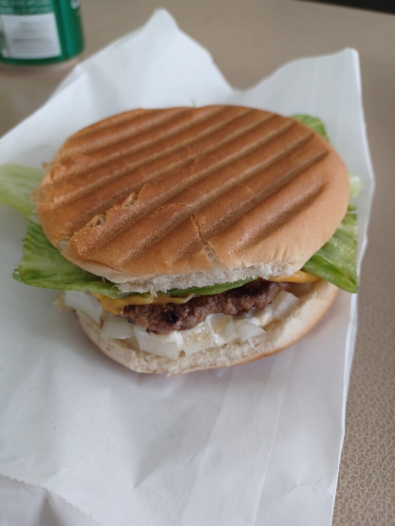 The patty, which I believe was charbroiled, was about 4oz and topped with processed cheddar. There was shredded romaine lettuce that didn’t hold up very well. The secret sauce was pretty good and I always enjoy a toasted sesame seed bun.