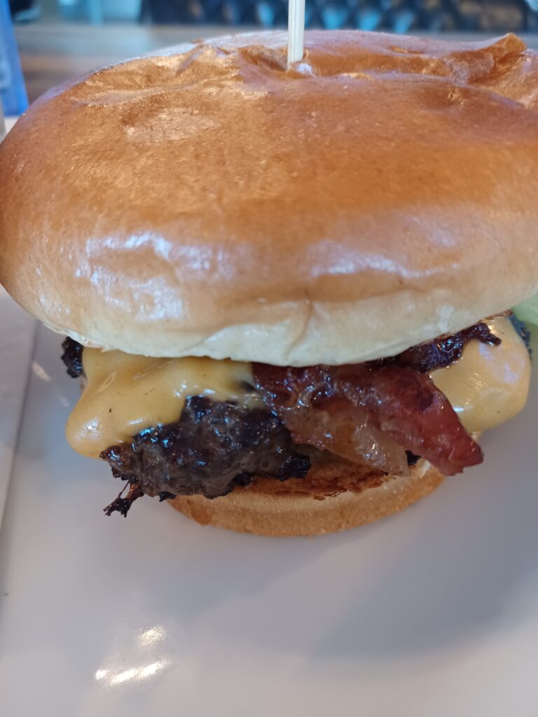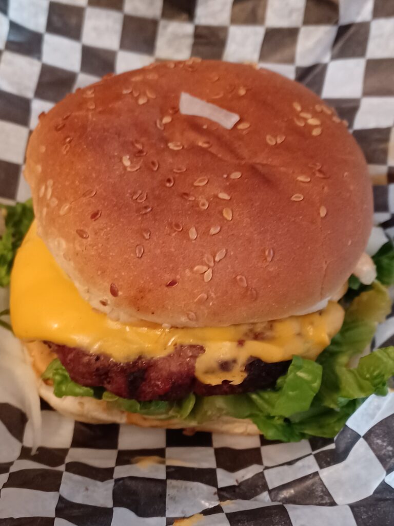 This featured what appeared to be a pre-formed patty. It was topped with some cheddar. I appreciated the iceberg lettuce. It came on a standard sesame seed bun that was lightly toasted.