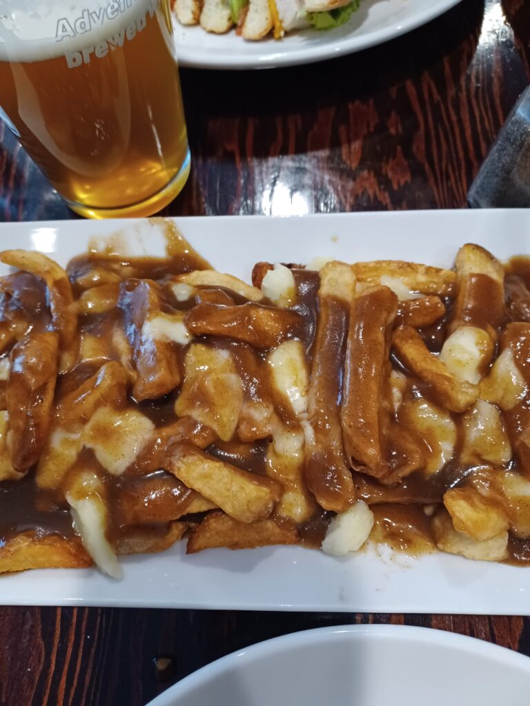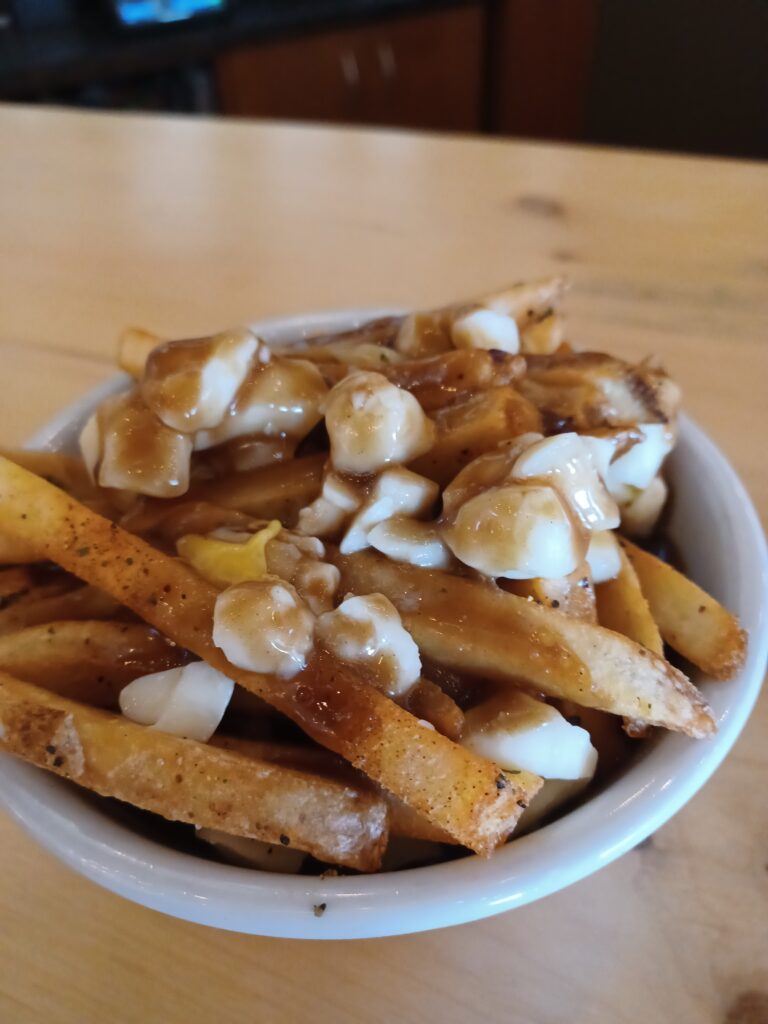 The poutine had skin-on frozen fries. There was an adequate amount of cheese. The gravy had a good flavour, but was too light.